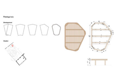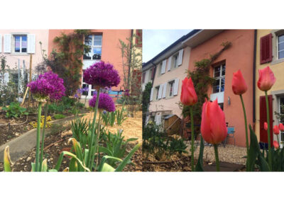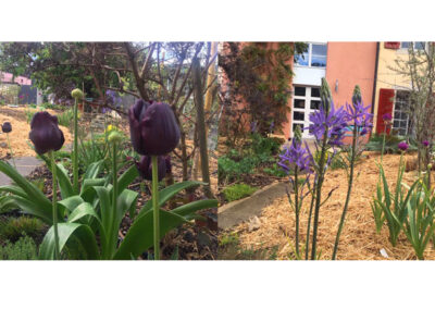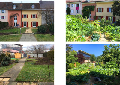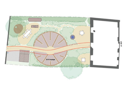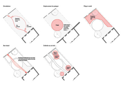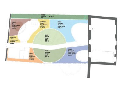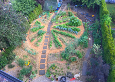 Réaménagement complet du jardin, la surface engazonnée et les haies de thuya cèdent leur place à un grand jardin potager rond et une barrière végétalisée. Trois espaces destinés à être aménagés en terrasse sont sélectionnés. Le reste du jardin est planté. Au centre, où il y a le plus de lumière, un potager en forme de mandala est créé. En périphérie, une ceinture verte composée d’arbustes, de vivaces et d’autres strates végétales est mise en place sur le principe de la haie jardinée.