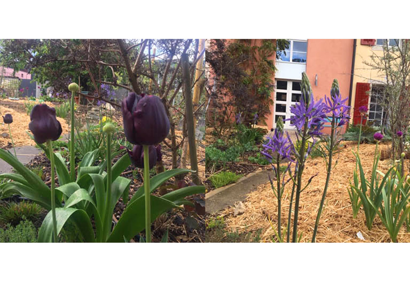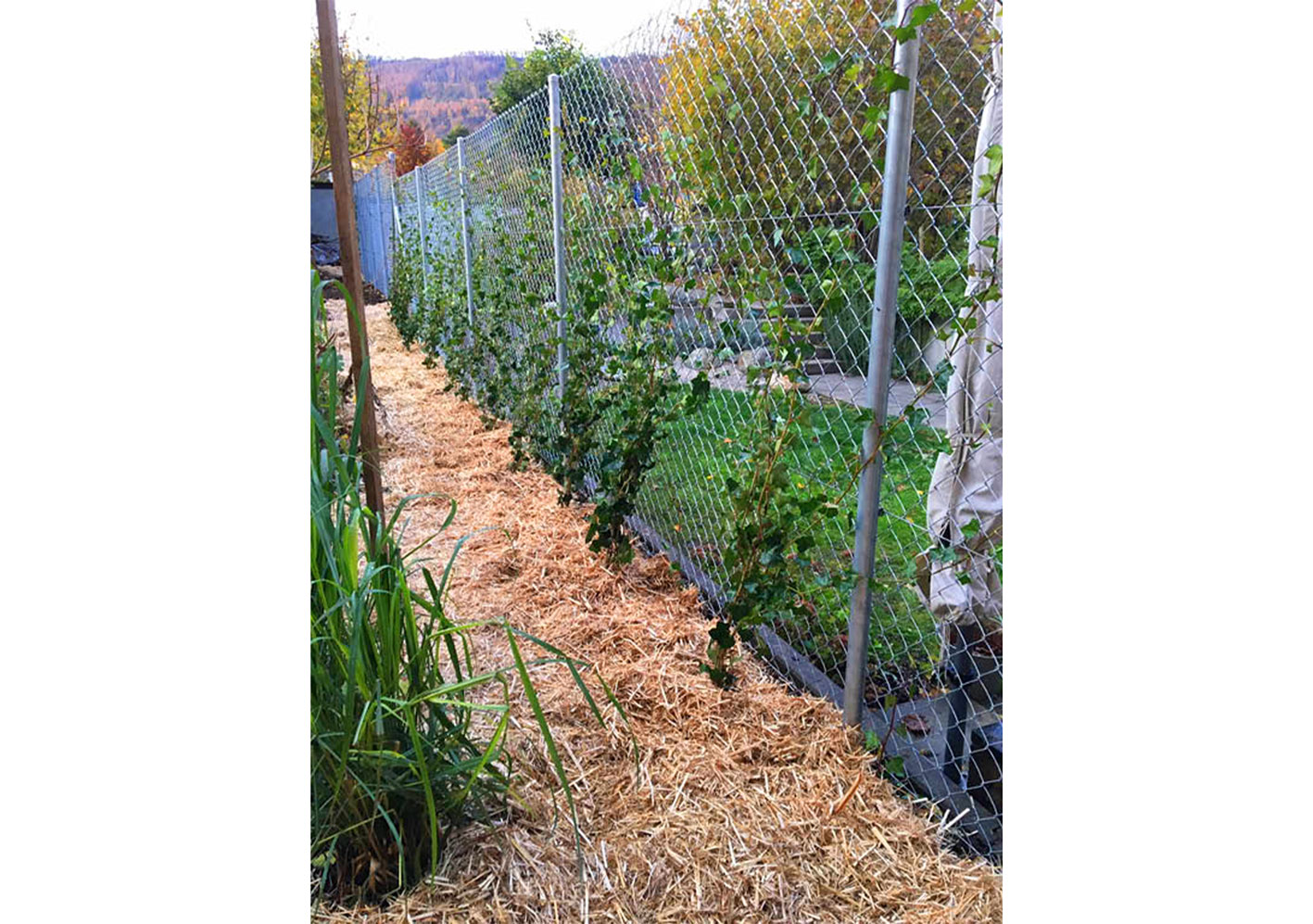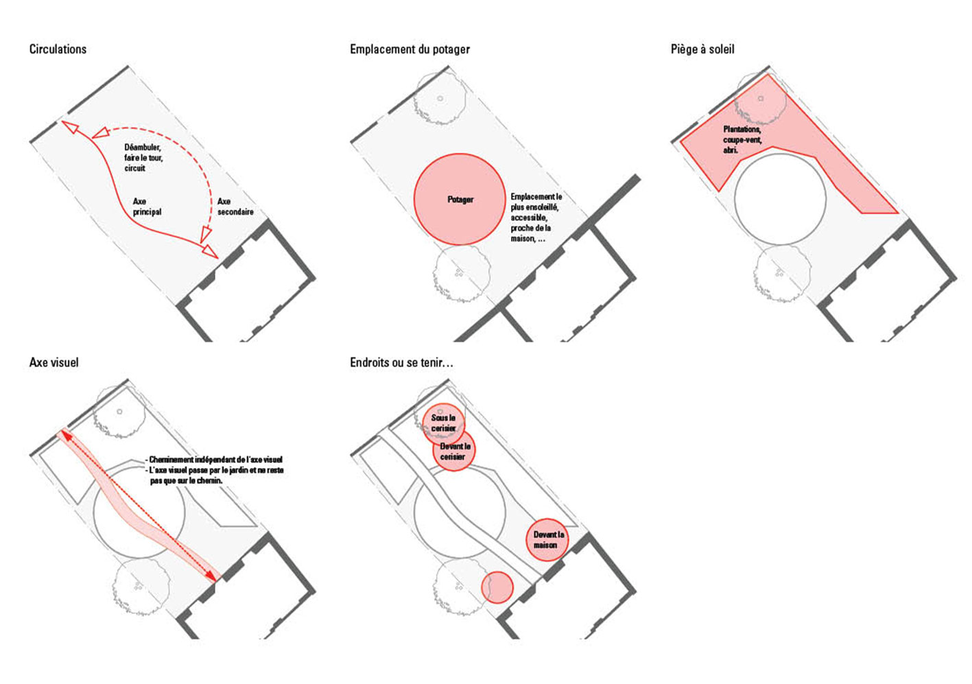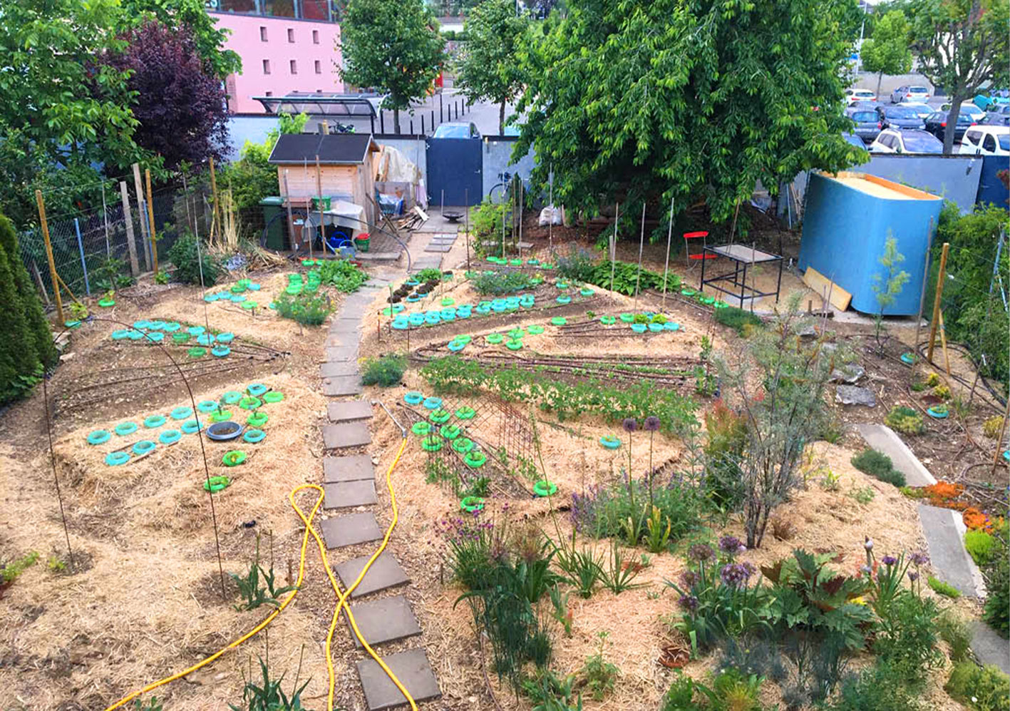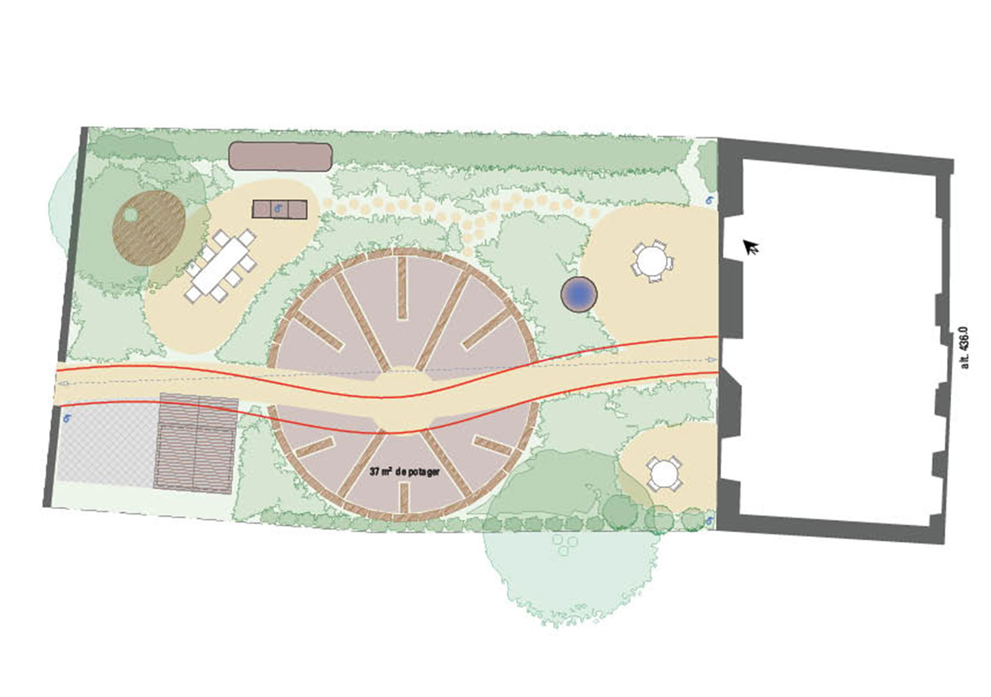 Réaménagement complet du jardin, la surface engazonnée et les haies de thuya cèdent leur place à un grand jardin potager rond et une barrière végétalisée. Trois espaces destinés à être aménagés en terrasse sont sélectionnés. Le reste du jardin est planté. Au centre, où il y a le plus de lumière, un potager en forme de mandala est créé. En périphérie, une ceinture verte composée d’arbustes, de vivaces et d’autres strates végétales est mise en place sur le principe de la haie jardinée.